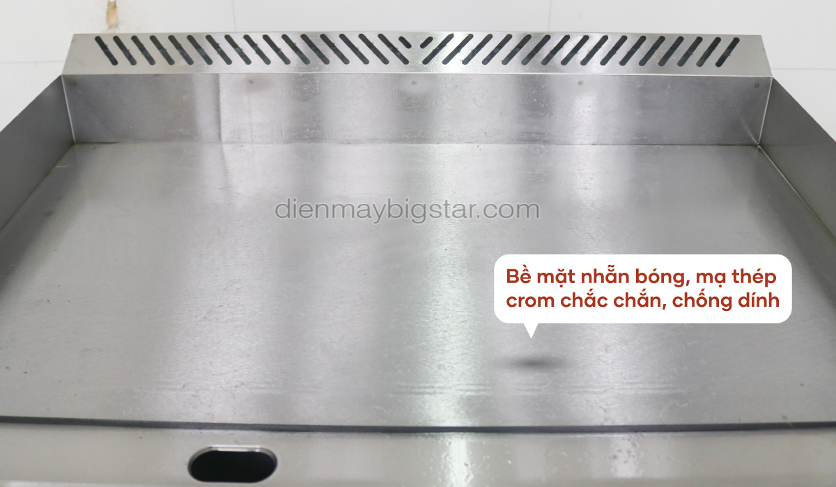 Bề mặt phẳng nhẵn bóng, làm tư thép mạ crom chắc chắn, không gây dính thực phẩm khi chiên. Diện tích mặt chiên lớn, có thể chiên được nhiều món ăn khác nhau và để được nhiều thực phẩm lên cùng lúc.