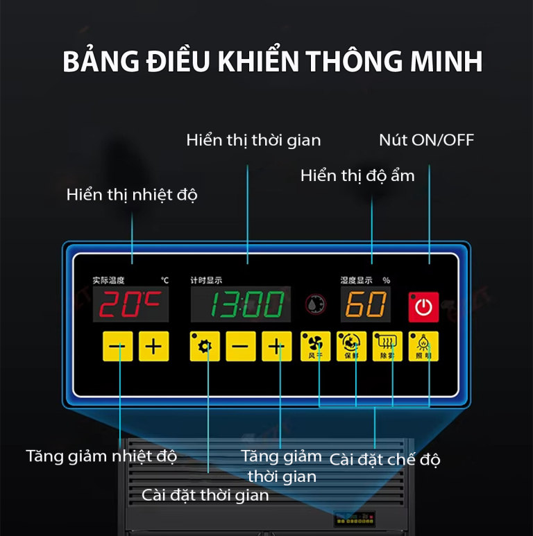 Bảng điều khiển thông minh được thiết kế tiện lợi, cho phép người dùng dễ dàng cài đặt linh hoạt nhiệt độ, thời gian và độ ẩm. Nhờ đó, việc điều chỉnh chế độ sấy phù hợp với từng loại thực phẩm trở nên đơn giản và chính xác.